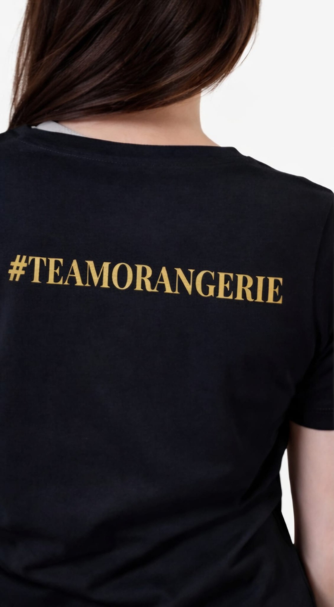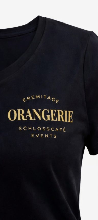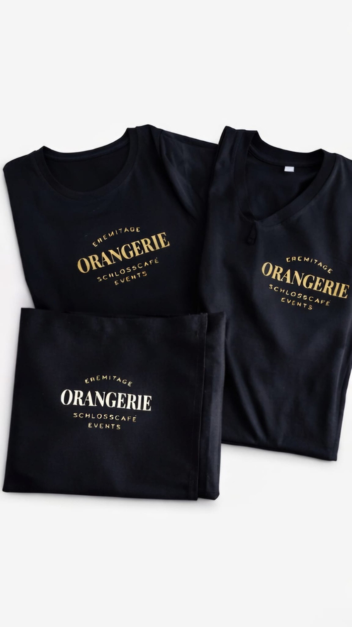 Hier durften wir, für die Orangerie in der Eremitage Bayreuth, das Logo in hochwertigen Flexdruck auf Textilien umsetzten. Vorne Logo, hinten Statement-Schriftzug. in den Farben weiß oder gold.